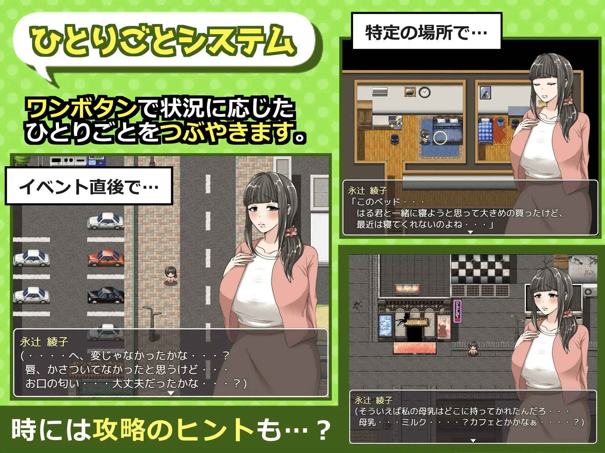 Ayako is a mature woman and loving mother whose life changes dramatically after a mysterious event. Her son falls ill with a strange and incomprehensible disease, and the only way to save him is to gather spiritual power. Rei, a charismatic and mysterious companion with special abilities, comes to her aid. Together, they learn to control energy and communicate at a distance through a spiritual connection. You will explore the city, help its inhabitants, strengthen your relationship with Rei, and gradually unravel a mystery that intertwines destinies, feelings, and powers beyond the ordinary.