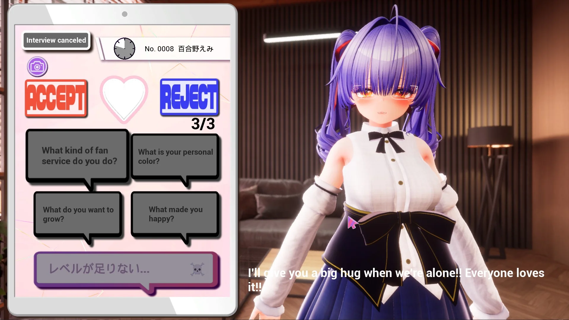 If you conduct interviews and live performances over and over again, your manager level will increase. During the interview, you can give the girls indecent instructions—check their underwear, use toys, and much more. The live performance begins immediately after the interview, and the girls who passed the interview in provocative outfits take the stage in the same attire. This is a prime example of abuse of power.