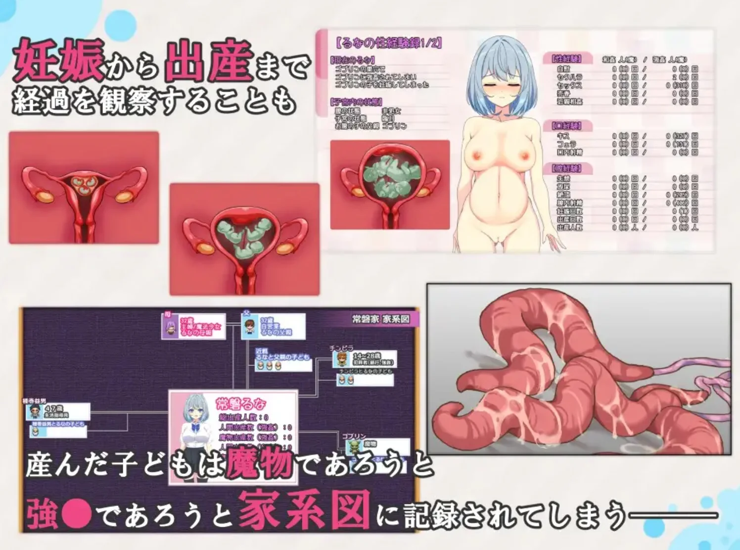 Tags: jRPG, Fantasy, Anal, Oral, Vaginal Sex, Group, Masturbation, Creampie, Blowjob, Incest, Mind Control, NTR, X-Ray, Rape, Straight, Corruption, Big Tits, Ahegao, Blue Hair, Female Protagonist, Pregnant, Tentacle
